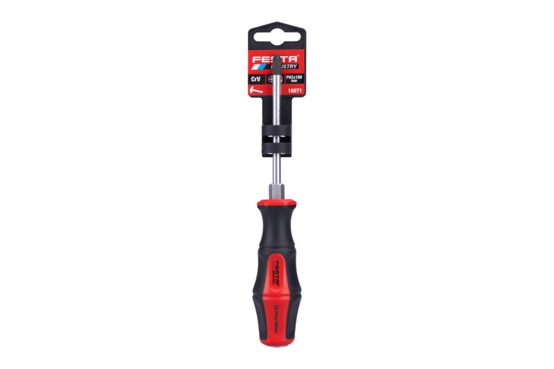 Der Metallschaft des FESTA-Schraubendrehers besteht aus hochwertigem Chrom-Vanadium-Stahl, die gehärtete Spitze ist magnetisch, der Schraubendreherschaft ist fest mit dem Schlagende verbunden, der Griff verfügt über einen Sechskant zur Verwendung eines Schlüssels, die Kombination aus Polypropylen und Gummi am Griff und seine ergonomische Form garantieren gute Rutschfestigkeit und gute Beständigkeit gegenüber Schmiermitteln und Chemikalien.
