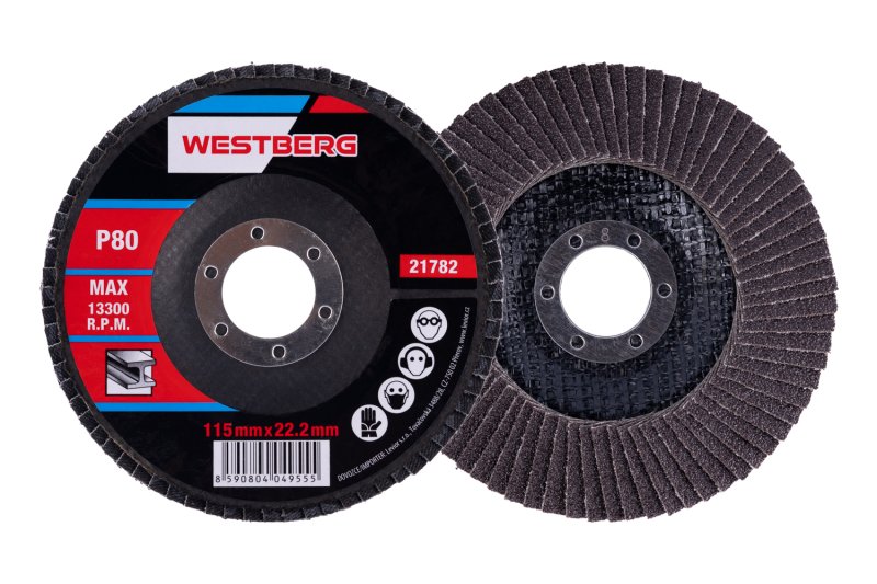 Fächerschleifscheibe, Körnung: 80, Körnung: Aluminiumoxid, Bindemittel: Kunstharz, Trägermaterial: flexibles Gewebe – 100 % Baumwolle (240–260 g/m²), Ausführung: gebogen, Loch: 22,2 mm, max. Arbeitsgeschwindigkeit: 80 m/s, max. zulässige Drehzahl: 13300 U/min, Verwendung: Schleifen, Schmirgeln, Lack abtrennen, ..., Maße: im Produktnamen angegeben.