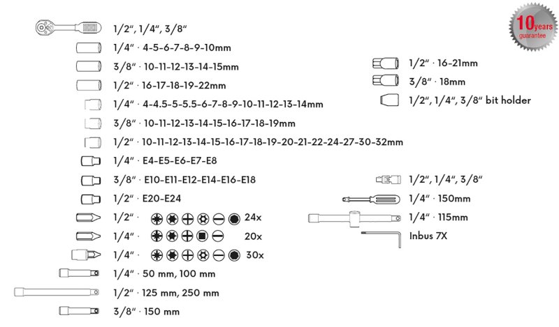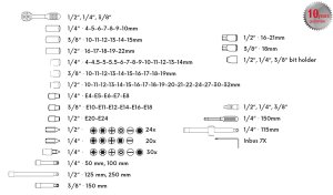 Fej- és hosszabbítókészlet 1/4,3/8,1/2. Minden alkatrész kovácsolással króm-vanádium acélból készült, jól kombinált készlet átlátszó műanyag tokban, racsnikkal billenőkarral és kioldógombbal, ergonomikusan kialakított fogantyúval.