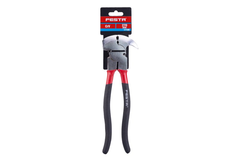 FESTA-Multifunktionszange, spezielle Backen der Zange sind für die Montage von Zäunen bestimmt, Klingen zum Schneiden von Drähten, ergonomische Griffe mit weichem Gummi-Anti-Rutsch-Schutz.