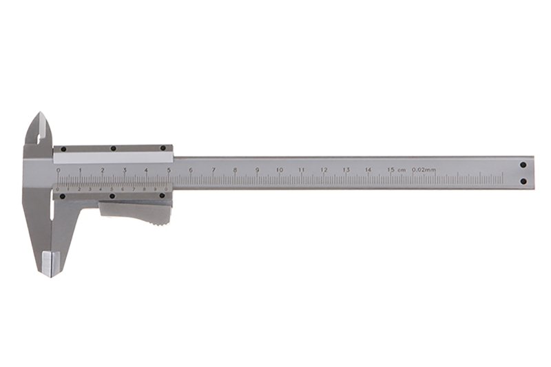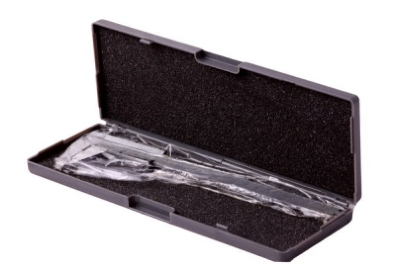 Slide gauge 0 - 150 mm with an accuracy of 0.02 mm, metric scale in mm, depth gauge, high-quality stainless steel, precise processing, smooth movement, push-button locking, unit conversion table, plastic case.