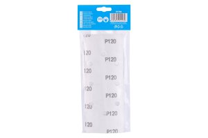 Sanding paper - set of 5 pieces, grit: 120, type: 8 holes - Black&Decker, type of grain: aluminum oxide, binder: synthetic resin, backing material: flexible paper C (110-135g/m2), dimensions: stated in the product name, packaging : blister with a paper card with a Euro hole.