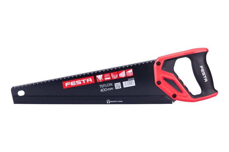 Length of working surface: 400mm ABS handle with softened TPR rubber, high-frequency hardened triple ground teeth, hardness: 47-52HRC, toothing: 7TPI handle, allows marking 45 and 90 angles.