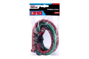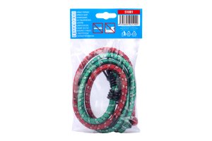 Elastic rubber straps, braided with polyester and ended with plastic-coated steel wire hooks on both sides for attaching luggage.