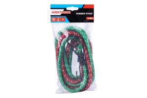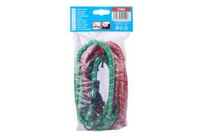 Elastic rubber straps, braided with polyester and ended with plastic-coated steel wire hooks on both sides for attaching luggage.