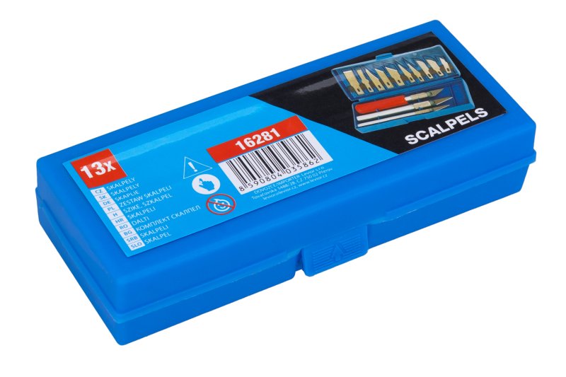 Többfunkciós szike készlet - kések, ergonomikus markolat gyorsszorító pengetartóval, széles felhasználási lehetőség modellkészítésben, faragásban, iparban, műanyag dobozban.