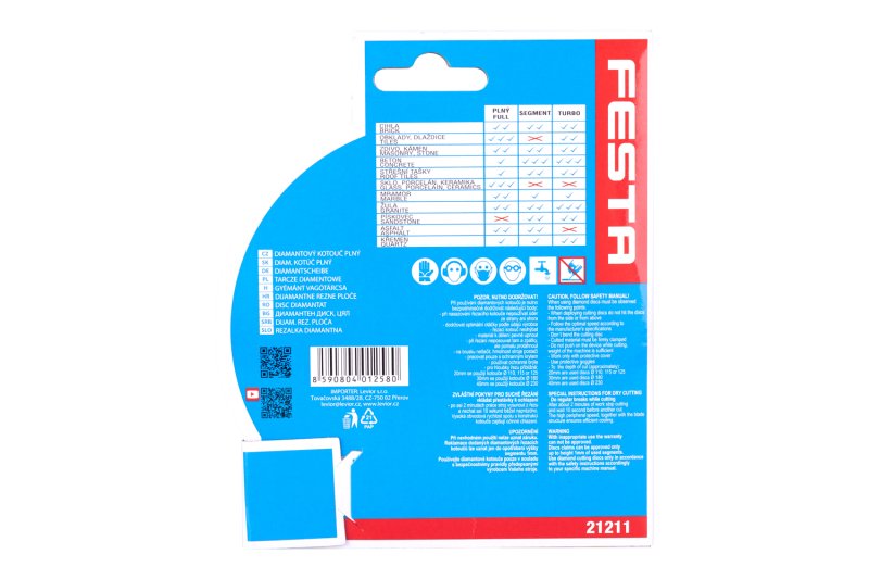 Profesionální diamantový kotouč FESTA, provedení : PLNÝ - celoobvodový, kvalitní diamantová vrstva s vysokým obsahem diamantového prachu, přesné zpracování - napojení na nosný disk kotouče odolávající vysokým teplotám, použití : určený pro mokré i suché řezání dlažby a obkladů, betonu, cihel, zdiva, žuly, mramoru, kamene, skla, keramiky, balení : blistr s eurootvorem, rozměry : uvedeny v názvu výrobku.
