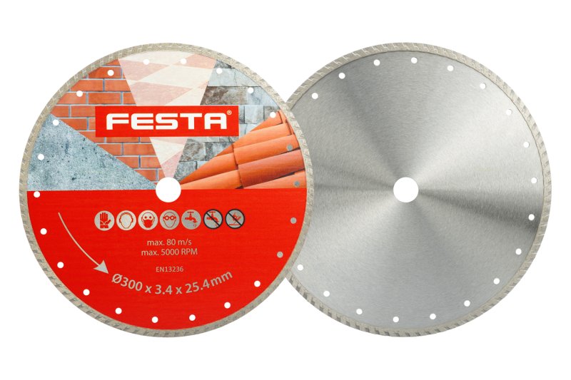Diamantový kotouč FESTA, provedení : TURBO, kvalitní materiály i zpracování, speciální tvar diamantových segmentů i konstrukce a pevné uchycení k nosnému disku kotouče, vysoký obsah diamantového prachu, použití : pro suché i mokré řezání betonu, železobetonu, cihel, zdiva, kamene, balení : blistr s eurootvorem, rozměry : uvedeny v názvu výrobku.